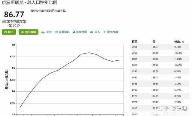 (截止2015年,俄罗斯的男女比例为86.77:100,接近87:100,在一百个人中,女性比男性多差不多13人。)