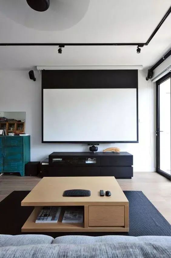 当然,在空间有限又有观影需求的情况下,可以选择抛掉传统的电视设备,让投影仪成为空间的主角。选择幕布或者大白墙,置入投影装备,铺上地毯,放上软垫或者懒人沙发,再来一些喜欢的零食饮料,一个充满氛围感的私人影院空间的产生了。