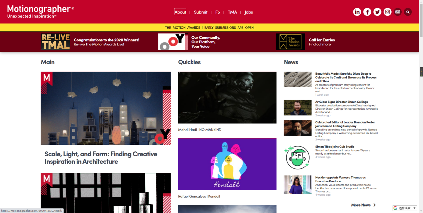 自网站2006年建立以来,Motionographer一直是运动设计社区的重要组成部分,是视觉故事讲述者磨练自己的工艺的重要社区,网站聚集了全球顶尖的视觉设计的大牛展示的动态图形视觉案例。