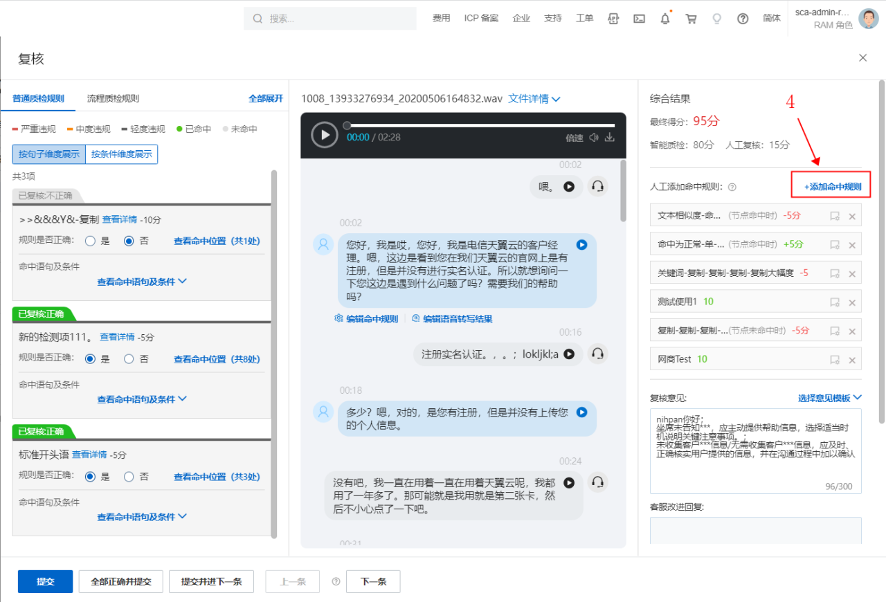 纯人工质检规则的运用是在智能质检完成后,由质检员在此系统平台上完成的,操作步骤如下: