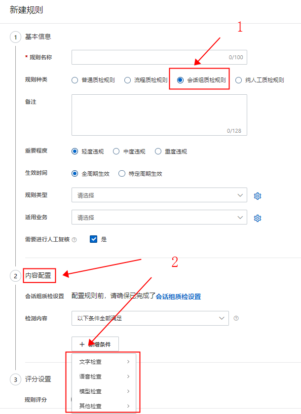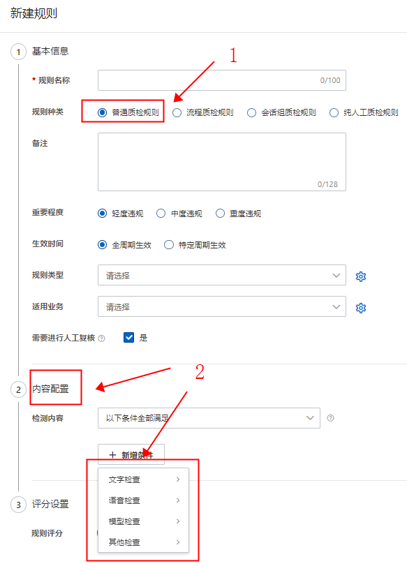 内容配置上,根据在步骤“1.填写基本信息”中勾选的规则种类不同需要配置的内容也不同,当前内容配置主要有三大类:普通质检规则和会话组质检规则内容配置、流程质检规则内容配置、纯人工质检规则内容配置。